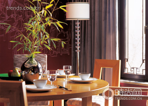 金属银色的花瓶比青釉瓷瓶更多了份时尚感。在浓墨重彩的墙面白描的映衬下,青竹以质朴的美感降低了色彩的饱和度,让餐厅色调清新宜人。