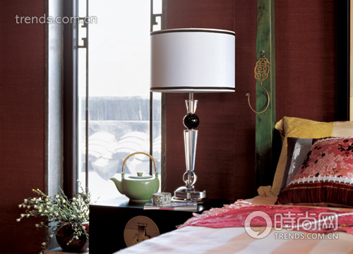 用中式的木箱作为床头柜,在红色背景中搭配现代造型的台灯,细节中强调了精致与实用。