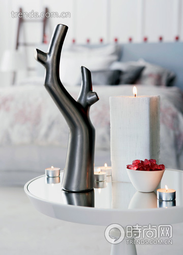 盛满红色糖果的骨瓷碗,搭配白色蜡烛与现代感十足的树形花瓶,冷色中的一抹红色格外打眼。烛光下,方形蜡烛肃静的单纯让空间充满古典的纯净意味。