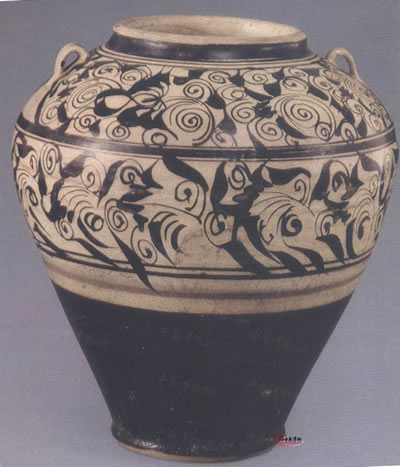 元 耀州窑白地黑花瓷坛 说明: 高36.1厘米,口径16.2厘米,底径13.3厘米 这件元代耀州窑白地黑花瓷坛,高36.1厘米,口径16.2厘米,底径13.3厘米。坛口为圆唇,口沿微敛,丰肩,深腹,肩以下渐内收,圈足。肩两侧对称饰双系,以双泥条捏塑而成。肩、上腹绘黑色花纹两层,线条流畅,黑彩上罩以透明釉,白中闪黄;下腹与器内满施黑釉,下底无釉。此坛形体硕大浑圆,花纹饱满,是元代耀州窑瓷器中的精品。     现藏于甘肃省博物馆。