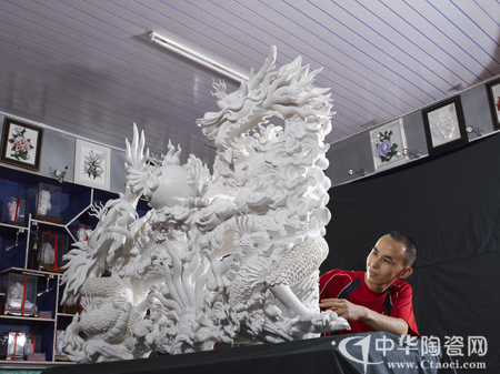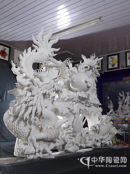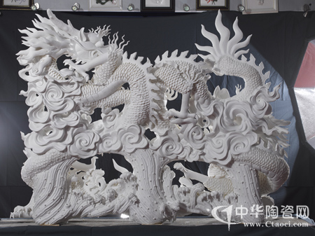 据两兄弟介绍,他们为了突破德化历来的小型瓷雕创作,从2000年开始构思,2003年开始烧制大型瓷雕《和谐中国》,每年烧制一尊,都因体积庞大容易变形、断裂,直至近期才烧制成功。作品《和谐中国》长1.68米,宽1.27米,重约470斤,双龙戏珠,造型和谐,以龙珠为中心双龙对称排列。