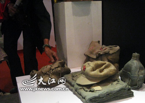 在一楼展厅中,2009景德镇当代国际陶艺展展出的作品,显示了中国、美国、爱尔兰、韩国等各地艺术家的创意。这其中,最逼真的陶艺作品是来自中国陶艺家名为《昨天》的展示。布满灰尘的红军帽、军用水壶、背包,略显破旧的胶鞋。几乎每一个经过这幅作品的参观者都会边用手摸摸,边说:“呀,是真的用瓷器做的。”