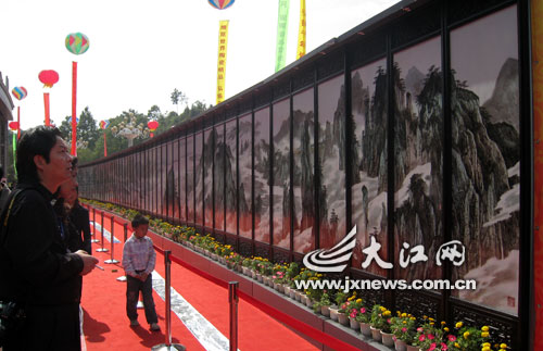 在展厅的入口处,作为新中国六十周年献礼作品,几幅瓷板画是瓷博会上当之无愧的庞然大物。画有灵猴、飞瀑、仙桃的《群猴集瑞图》是目前世界上最大的粉彩瓷板画,也是世界最大的以动物为题材的粉彩画。它与陈列在旁边的《马到成功图》共同分享2009瓷博会展出的最大单瓷板画桂冠,同时这两幅作品也列入吉尼斯纪录。另一边,全长42米的《西江揽胜图》全景展现了江西的壮丽风貌,该作品已经申报吉尼斯世界纪录。