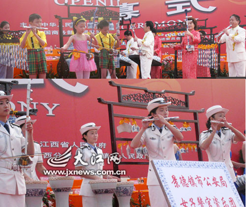 这两年的瓷博会开幕式上,瓷乐表演一直成为媒体关注的焦点。今年,开幕式瓷乐演奏首次由4个瓷乐队、80多个乐手同台完成,除以往的专业瓷乐队,来自台湾地区和韩国的瓷乐表演艺术团体、老年大学瓷乐队外,新成立不久的群艺馆少儿瓷乐队和警官瓷乐队也加盟演出。在同一个舞台上,全球爱好瓷乐的朋友,不分年龄和民族,在千年瓷都展现出陶瓷文化的无穷魅力。