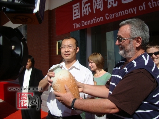 10月22日上午,参加第一届“德化月记窑国际当代陶艺家柴烧研讨会”,来自澳大利亚、荷兰、芬兰、立陶宛、爱沙尼亚、印度、美国、哈萨克斯坦的八位陶瓷艺术家向“中国瓷都”福建德化的陶瓷博物馆捐献了出各自的代表作品。博物馆同时向八位捐献者颁发收藏证书,该八件陶瓷艺术作品正式成为德化陶瓷博物馆的馆藏之宝。