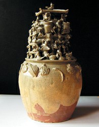当青铜文化翻到陶瓷文化的这一篇章的时候,中华大地也发生重大变化。东汉末年的三国纷争,到两晋时期的八王之乱,外族入侵,南北分裂。整个社会动荡不安,人民饱受战乱之苦。在这样大的历史背景下,佛教在中国开始大肆盛行,各种各样的佛塔也在全国各地纷纷建起,人们通过对佛教皈依寻找精神的寄托。反映到手工业上面,就是青瓷佛寺罐的出现。这种以佛塔为原型的器物,不仅是佛教文化在世俗社会的体现,同时也是当时社会状况的真实反映。在中国文化中,灵魂不灭的思想一直延续了数千年。当佛舍利塔传入中国,立即被本土的丧葬文化所接受,作为随葬的冥器的青瓷佛寺罐不仅是佛家存放舍利的器物。佛寺罐不仅有佛塔的造型,同时是堆有各种动物,飞鸟乃至仆人簇拥的死者生前生活场景再现。