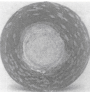 由于胎泥含砂量高,修胎时往往发生阻刀、跳刀现象,在器底及圈足内能清楚地看见跳刀痕(图1)。而胎体表面留下波浪痕经施釉后,其痕迹虽有所减弱,直面观测不易发现,但用手触摸胎表仍可以感受到呈竖条形的起伏,在适当的角度侧视,肉眼可见呈竖条状的釉层挂附不匀等肌理现象(图2)。
