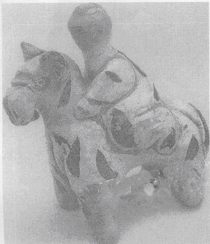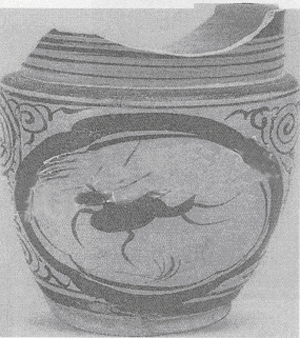 3.画风画法。吉州窑古陶瓷装饰,无论是剪纸还是彩绘,讲究简练的画风画法和疏朗有致的图案布局,往往寥寥数笔勾勒成形,或点缀几笔以打破平面,极其写意又十分传神(图3),绝无文人骚客笔下的山水人物、花鸟虫鱼,即使同画梅花也别具一格。其图案均源于自然,取自民俗生活,多以自然物为对象,如菱花(图4)、团花、梅花、梅枝、蕉叶、奔鹿(图5)、彩蝶、波涛、猫、狗、虎(图6)、马(图7)、虫、鱼,常见“金玉满堂”(图8)、“长命富贵"、“龟鹤齐寿”、“儿孙满堂”、“多子多福”、“金桂玉兰”等吉祥语剪纸,还有马上猴(寓立刻封侯意)、凳上猴(图9)等彩绘泥塑瓷。这些装饰图案质朴明快、童趣盎然,民俗理语特点鲜明,浓烈的生活气息扑面而来。