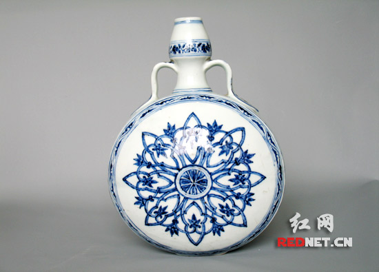 湖南省文物总店负责人郭学仁介绍说,绶带葫芦扁瓶又称“抱月瓶”或“宝月瓶”,明代洪武御窑厂烧制,其造型和纹样取自波斯金银器,较为奇特。永乐时期航海家郑和七次下西洋,中国与西域国家的交往十分频繁,大量向西域国家出口具有波斯装饰风格的青花瓷。此瓶纹饰细密而严谨,制作精致,为明永乐时期御制佳器。在2006年北京翰海春季拍卖中,也有一件同样的葫芦扁瓶,成交价为1540万元。