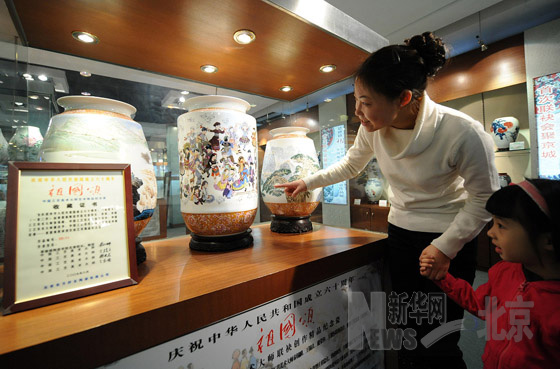 11月28日,观众在北京王府井陶瓷城参观由四位中国工艺美术大师创作的纪念瓷《祖国颂》。 《瓷都传人——2009当代景德镇陶瓷艺术作品展》11月28日在京展出。近千件现代陶瓷艺术精品汇集北京王府井陶瓷城,由中国工艺美术大师秦锡麟、王锡良、戴荣华、王恩怀为庆祝新中国成立60周年,联袂设计、创作的纪念瓷《祖国颂》在本次展览中展出,引起首都收藏界和陶瓷文化界人士的瞩目。