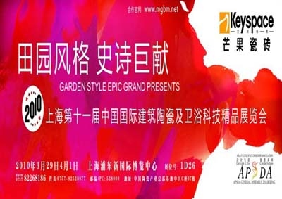 2010年3月29日—4月1日,“第十一届中国国际建筑陶瓷及卫浴科技精品展览会”将在亚洲规模最大、最现代化的展馆之一——上海浦东新国际博览中心隆重召开,展会同期将联袂“第十八届中国国际建筑装饰展览会”、 亚洲最大的“第十九届上海国际酒店用品展”、设计盛典“2010中国国际建筑及室内设计节”等共同登场,谱写年度行业最令人期待的盛会。