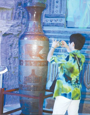 这个高2.2米,朱色的坭兴陶大花瓶,名字叫“世博缘·壮乡情”。场馆负责人告诉记者,这是目前世界上最高的坭兴陶花瓶,是广西为世博量身订造的一件展品。传统的瓶形上,绘有丰富的世博元素和广西元素。世博园中国馆造型、世博吉祥物海宝的形象、世博会的会徽和广西的山水、第四届中国东盟博览会会址广西南宁国际会展中心等,交相呼应了瓶身上刻着的“城市,让生活更美好”和“绿色家园·蓝色梦想”的两个主题,表达了壮乡人民迎世博、参与世博的真挚情感,也引起了不少游客的关注。