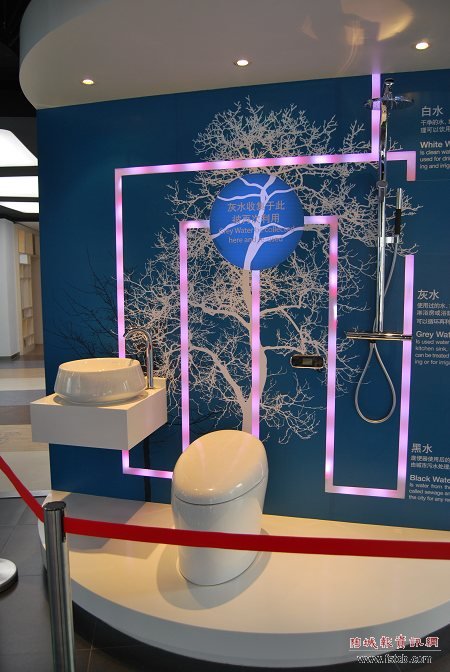 位于“沪上·生态家”三楼的科勒展区强调互动与体验,把老上海的建筑风格和蓝色水滴的设计元素融为一体,通过“灰水光影演示区”、“灰水循环演示”、“未来卫浴空间”、“电脑互动墙”等主题区域向游客展示了科勒节水环保的理念。据现场工作人员介绍,“在该展区里,游客可以在精心布置的未来生活场景中体验卫浴环保带来的乐趣。”