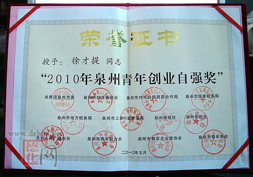 在由团市委、市经委、市外经贸局、市国税局、市地税局、市工商局、泉州晚报社、泉州电视台、泉州人民广播电台、市青联、市青企协、市青商会联合开展“2010年泉州青年创业奖”评选活动中,德化县徐才提荣获“2010年泉州青年创业自强奖”。