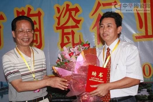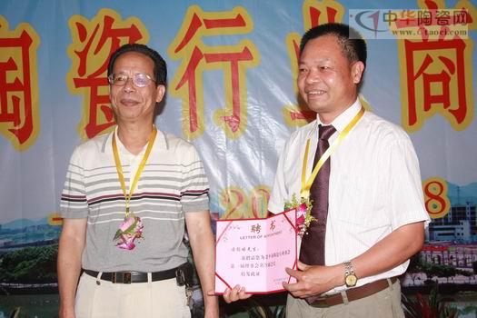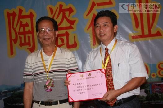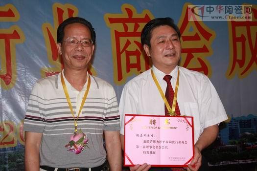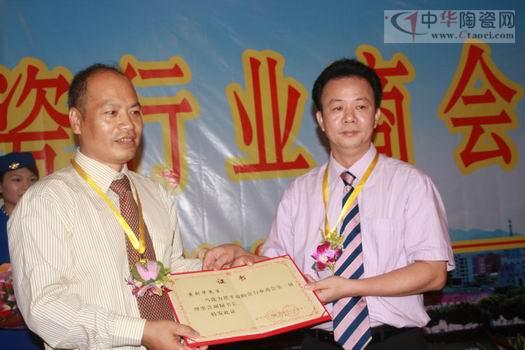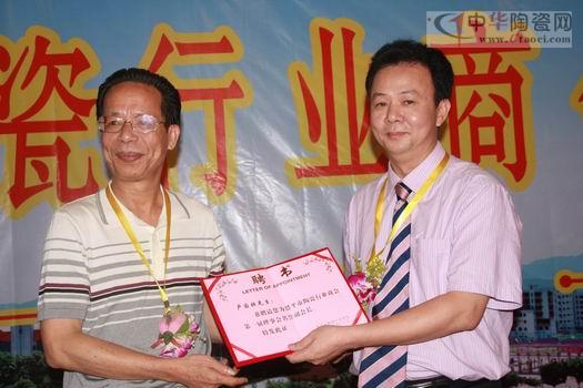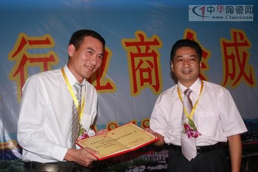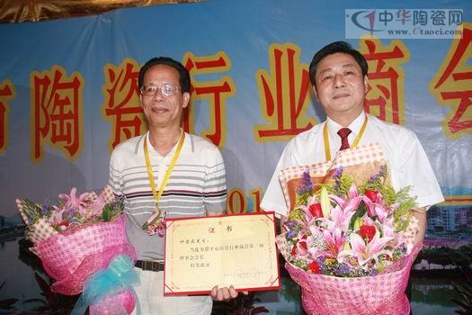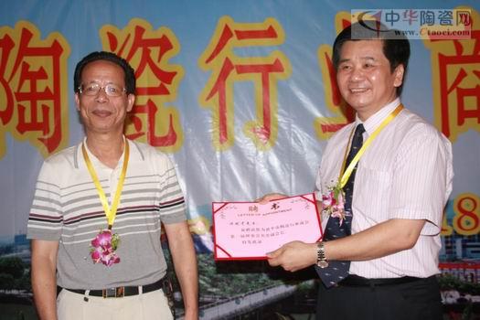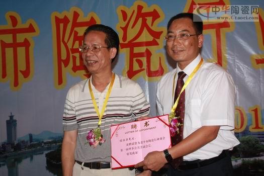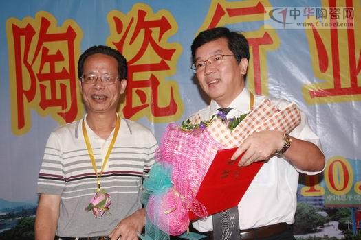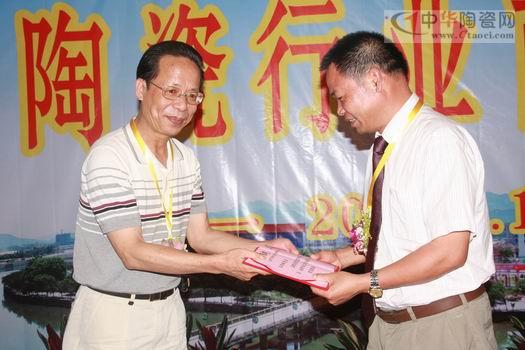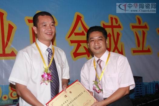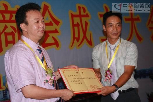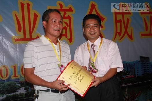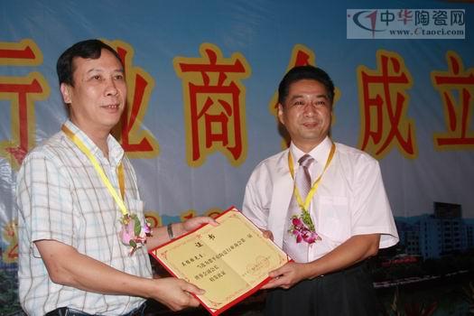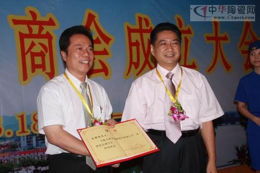 恩平市委书记、市人大常委会主任魏志平为当选的市陶瓷行业商会第一届理事会会长叶荣崧颁发证书。
