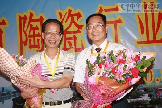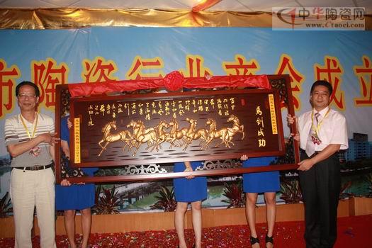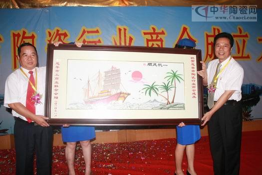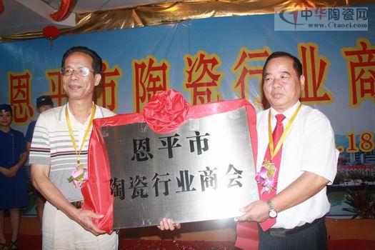 恩平市工商联(总商会)主席张活林代表市工商联(总商会)向恩平市陶瓷行业商会颁授牌匾,恩平市陶瓷行业商会第一届理事会会长叶荣崧代表恩平市陶瓷行业商会接受牌匾。