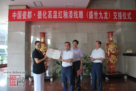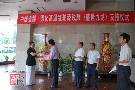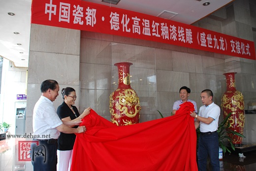 8月30日,新华社在北京新华社总部举行交接仪式,县委县政府赠送新华社的一对名为《盛世九龙》的九九红高温红釉漆线雕瓷瓶,正式交接给新华社收藏。