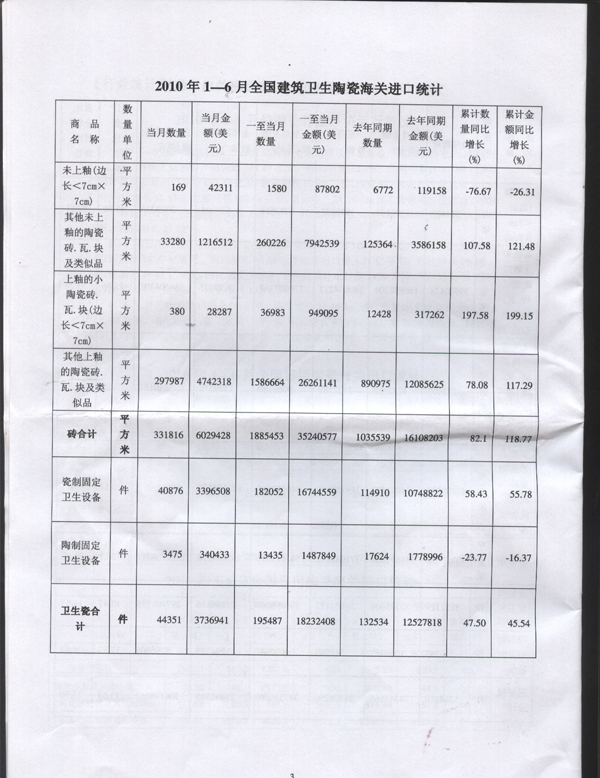 2010年1—6月全国建筑卫生陶瓷海关进口统计