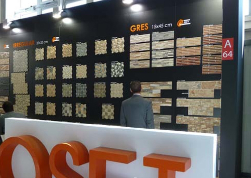 上一届的博洛尼亚展的产品主要以仿古砖、瓷片为主流,而本届展会的参展产品有所变化,大量的仿石材、仿天然石的登台亮相,成为这次展会的主流展品。