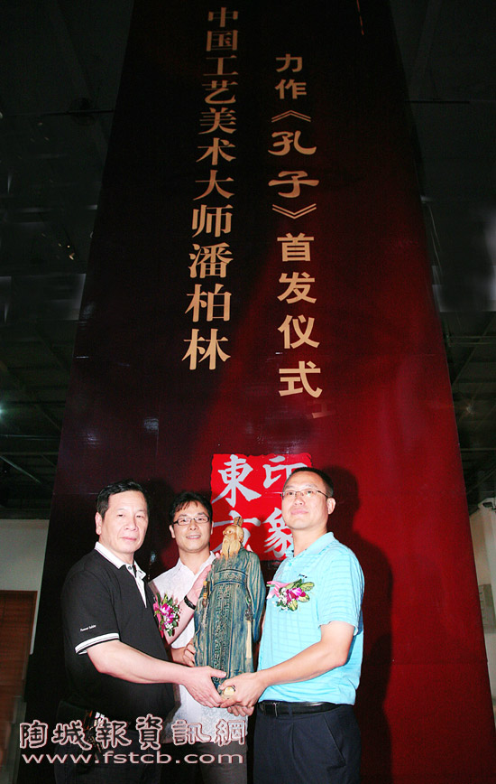 此陶艺作品《万世师表——孔子》是根据周润发主演的电影巨献《孔子》原型启发而创作的,潘柏林大师在创作中既采用石湾陶塑传统的技法,如线条刻画,衣纹构造,肌理表现,十分工巧仔细,体现大师深厚功力;又吸收现代雕塑的简练手法,造型洗练流畅;着釉上更是大胆创新,采用透明玻璃质效果的青绿釉着色在整套衣服上,釉色古拙亮泽,又流动成画状图案,而且件件变幻,各自晶彩。为了最好地创作出满意之作,潘柏林大师认真研读关于的著名和画作,三度观看《孔子》影片,还查阅春秋时代的头饰、冠冕、服装、衣带、鞋的特色,佩剑、发簪、玉佩的图案、纹理、材质,都研究透彻,一丝不苟。在釉色上,不惜用了六件作品试釉,直至最后定色,反复比较,高度重视作品效果,确是前所未有。《万世师表——孔子》为限量收藏品,在当日首发式上其中一件由东方印象艺术馆和潘柏林大师捐赠给佛山祖庙内的佛山孔庙珍藏。佛山祖庙相关负责人对这种弘扬文化事业之余不忘社会公益的善举大加赞扬。(记者 潘炳森)