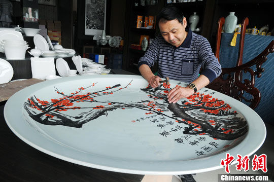 10月14日,山东省陶瓷艺术大师李秋峰正在对刻瓷作品《梅香》进行最后修饰。至此,历时20天、在直径1200厘米的青釉瓷盘上创作的刻瓷作品《梅香》正式完成。中新社发 闫盛霆 摄