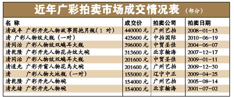 一名收藏广彩的行家表示,广彩器物上通常满工,既有工笔,又有写意,而且原料多,不但是图案,连背景、底色都要数次染出,工夫不是简单的勾勒可以比拟。随着瓷器市场的轮番炒作,日渐被理解的广彩有可能成为下一个上涨的板块。