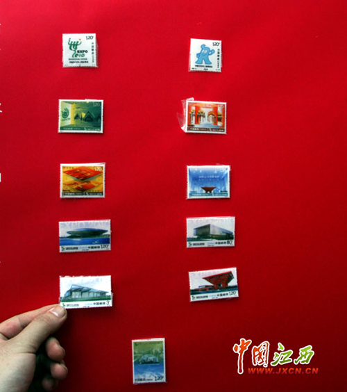10月19日下午,全球首套陶瓷邮票《世博国瓷珍邮》在景德镇首发。图为11枚以景德镇古法和现代科技方法融合烧制而成的世博陶瓷邮票。