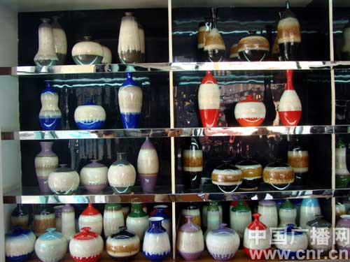记者摸着几种造型各异,光滑鲜艳的装饰艺术瓶,手感十分舒适,看上去就像玻璃与琉璃的效果那样亮丽,且颜色从鲜艳到渐变,产生了不同过度色的独特效果。问起二人今后的打算,二人你一言他一语的说道:我们今后想往实用性上发展,要争取在器形、釉色等方面创新的同时加上实用性的因素,烧出一些自己认为满意的东西来,虽然难度有但我们有信心做下去……