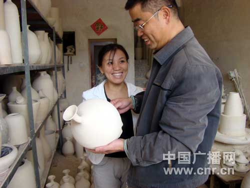 为了进一步了解陈新初这对夫妇两年多来对自己刻意经营的陶瓷产品的发展,10月20日上午,记者如约来到了他们的工作间。陈新初、黄国珍夫妇也较为详细地跟记者说起了他们自己的故事。陈新初向记者说:几年前他们夫妇都是景德镇国营陶瓷厂的下岗职工,然而,下岗后经过一番挫折和努力终于又干起了老本行。但即使干老本行也是逐渐在摸索中一步一步走过来的,其中的酸甜苦辣都也都尝试过了,就像众多的景德镇下岗职工一样,最终靠着自己的追求和努力,干出了自己的一番小天地。