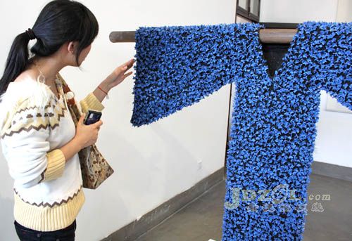 这件以“蝴·蝠·福”为名的作品清丽高雅,雅而不俗。作品作者郑祎告诉记者,这个作品没有使用惯用的手法,将陶瓷图案画在服装上,而是做了近万只陶瓷蝴蝶,将陶瓷与传统服饰相结合,使陶瓷可以穿上身的愿望实现。