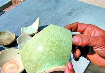 昨日上午,普查小组来到水库,只见这里依山傍水,盛产高岭土和釉水等矿产资源,具备烧制青瓷的条件。在水库原储水处发现了大量陶瓷片,堆积层厚达1至5米。普查组专家随手拿起一件碎瓷,碗底有一个明显的乳心。专家称,这是明显的元代青瓷特色。