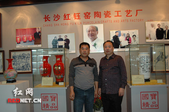 (长沙红钰窑陶瓷工艺厂总经理陈建铭[右]告诉记者,他们拥有自己的优秀专业研发团队。)