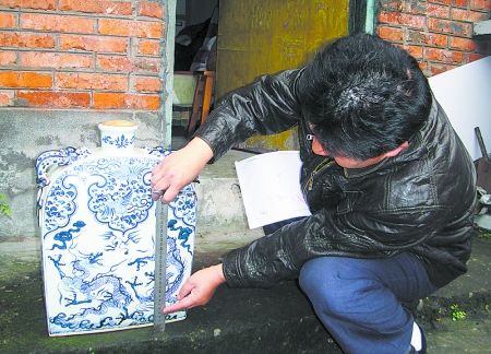 昨日,眉山市民李明明(化名)称,在清理老屋时,他发现老屋的床下放着一个腐朽的木箱,打开一看,里面全是厚厚的稻草,一个陶瓷扁壶静静地躺在里面。扁壶上,两面图案相同,壶下半部分绘二龙戏珠,上半部分两只凤凰傲然飞翔,两边各绘有一朵灵芝,辅以水、云纹等。在壶的两侧,各有三朵牡丹,壶颈处画有两朵牡丹,壶肩四只螭朝上匍匐着。