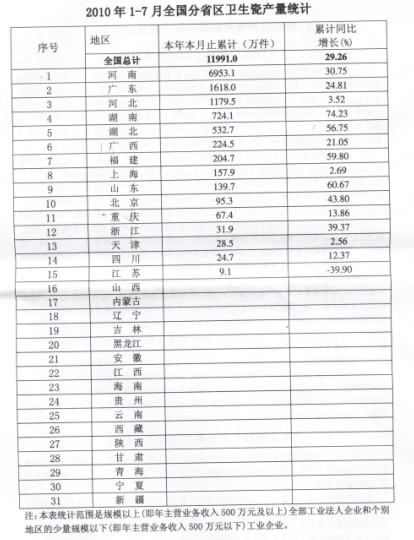2010年1—7月全国分省区卫生瓷产量统计