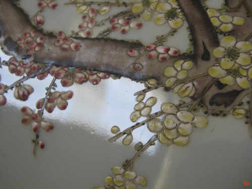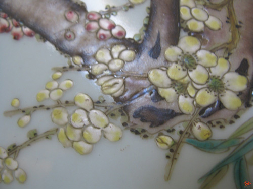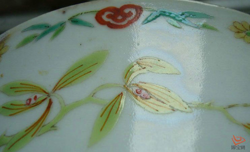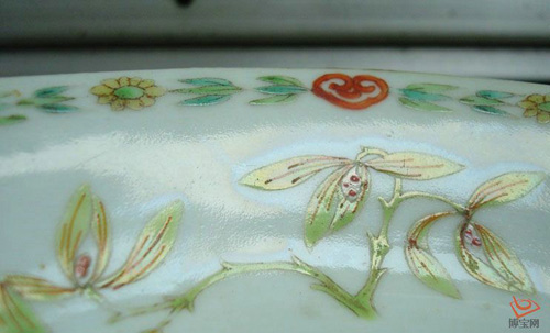 “光晕”,不是鉴定真伪的依据。据笔者所知,现代景德镇所烧粉彩瓷器都有光晕。是因为烧造温度的关系。但若能细心比较、甄别和体会,能对老的光晕和新的光晕的物理表现有所区别的话,它亦不失为鉴定彩瓷真假的好依据,尤其是明代五彩。