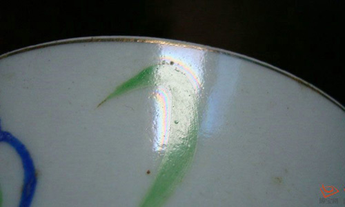 “蛤蜊光”,按照晚辈的经验和了解,目前景德镇还不能仿造蛤蜊光。但有蛤蜊光并不能绝对推断彩瓷为真!只能说“有蛤蜊光,极大多数的彩瓷都是老物”。真的蛤蜊光紧紧围绕在彩的周围,很细小很均匀的光圈,彩浓厚的地方蛤蜊光比较明显,彩薄的地方蛤蜊光比较淡。而假的蛤蜊光圈比较粗大、片状的、不自然,而且浓厚彩四周的光圈和淡彩四周的光圈是一样明显的,没有真的那么自然。现在造赝者,用“电光水”、真空镀膜法制造“蛤蜊光”;景德镇的仿古瓷厂,改进工艺配方,使一出窑的五彩。