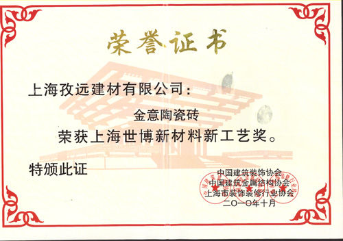 广东金意陶陶瓷有限公司荣获世博新材料新工艺奖,以及世博工程建设功勋人物奖。这个世博新材料新工艺奖是由中国建筑装饰协会、中国建筑金属结构协会、上海市装饰装修行业协会共同主办的“创意品牌,拥抱世博”大型主题系列评选出的,主要是针对上海世博场馆中用到的一些材料进行评选,陶瓷行业有三个品牌获得了这个奖项,分别是:金意陶、诺贝尔及亚细亚。温哥华馆、俄罗斯馆都使用了不同风格的金意陶瓷砖,分别是现代风格的领秀石代以及古典的经典古风,它们的空间感觉和味道是获得亲睐的主要原因。