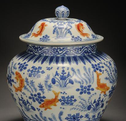 时至嘉靖朝,青花五彩于一朝间从面貌到韵味都发生了一次巨大的变化,仅以嘉靖青花五彩鱼藻纹盖罐为例,竟判若云泥。一取典雅,以极淡雅之青花为主,矾红色的游鱼并不刻意夸张;一取浓艳,青花发色浓艳并加添绿、黄、红釉之诸般水藻纹。同时,两者虽都刻画有非常写实的红鲤鱼,可是前者以三层水草、水藻、束莲为主,鱼游其间,动静相宜;后者下部为水草、荷叶、莲花散布,上部藻类、落花散落星罗,鱼则极夸张,硕大而略显笨拙,更添加俯视效果图者,遂使画面之完整与透视感均显杂乱。但两者相加,全球传世真品仅见7件。国内一件藏于故宫博物院,一件藏于国家博物馆,一件藏于首都博物馆,一件藏于天津博物馆,海外除英国一件外,另两件原为“暂得楼”旧藏。