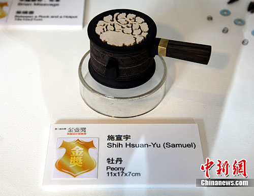 11月2日,第三届台湾金壶奖陶艺设计竞赛展近日在台北县莺歌镇陶瓷博物馆开幕。图为展出的金奖茶壶。