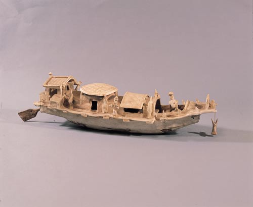 原件于1954年广州沙河顶出土,已调中国历史博物馆。这是一艘内河或沿海航行的客货两用船,分前中后三舱。船尾有望楼,船前系锚,后有舵。船头两边安插浆架三根,舱内横架梁担八条,以加强船体结构的牢固及加深吃水量。“舵”的发明是我国古代人民对世界造船史的一大贡献。1958年,英国著名科学家李约瑟博士为编写《中国科学技术史》一书访华,在广州博物馆意外发现了这艘东汉陶船,惊喜万分。此陶船证实了李约瑟之前提出的伟大推想:中国在公元三世纪或更早时期就发明了船尾舵,比欧洲早了近一千年,此结论随后被李约瑟写入《中国科学技术史》。(记者 赵婷)