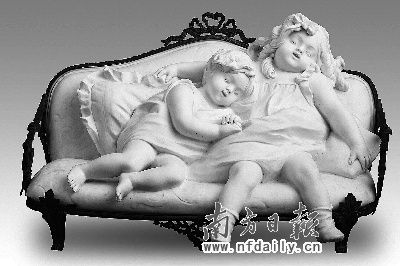 展览中有一件来自德国的“德国素胎瓷塑孩童像”十分精美,瓷塑中的两名小孩,一男一女,相依而睡,脸带淡淡的微笑,是难得一见的瓷塑珍品。因为18世纪以前,欧洲还没有陶器,直至18世纪初,在中国和日本影响下,欧洲各国纷纷开始生产瓷器,而德国是欧洲第一个生产出瓷器的国家。这件“德国素胎瓷塑孩童像”是陈嘉庚当年花120元在北京琉璃厂古玩市场买下的。当年120元钱可是一大笔钱。(记者/李培)