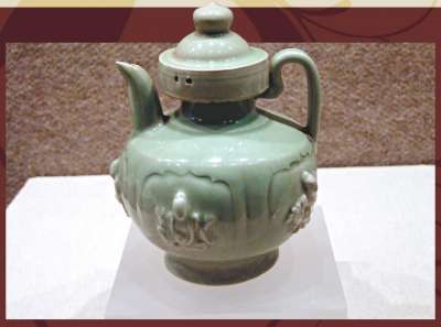 在展览橱窗里,陈列茞圳「宝光艺术」主人杨思明的多件精緻藏品,其中北宋时期耀州P的「青瓷贴花俳优执壶」最为耀眼。专家向记者介绍,这个壶造型优美,釉色淡绿,温润如玉,腹部壶门形开光内,以模印贴花俳优作装饰,具有北宋耀州青瓷之典型特徵。在已经知道的国内外收藏之中,这件壶是孤品,异常珍贵。执壶肚子上有六个俳优的深浮雕,那些表演艺人或说书,或弹琵琶,或演双簧,造型生动。深浮雕反映了北宋或稍早的晚唐、五代之际艺人们的表演生涯。