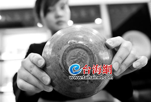 导报记者昨日提前看到了两款展品,一个是“建窑兔毫黑釉盏”,另一个是“建窑黑釉供御款束口盏”。两款都属于建窑黑釉的顶级珍品,花纹都是在烧制过程中天然形成的,非常奇妙,其中的“供御款”(如图)还是当时进贡的贡品,据传,宋徽宗就偏爱建窑黑釉,专门用黑釉茶盏品茶斗茶,因而皇室也都纷纷流行黑釉盏。因而,这两款分别估价50万元。(记者 香卉辉/文 吴晓平/图)