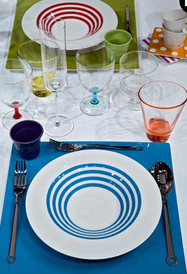 这套Royal Fine China餐布售价34欧元,Sambonet出品的Party不锈钢餐具每套售价2.4欧元。陶瓷水杯来自Revol,www.revol-porcelane.fr;带有彩色杯底的水杯来自Vetrerie Riunite。