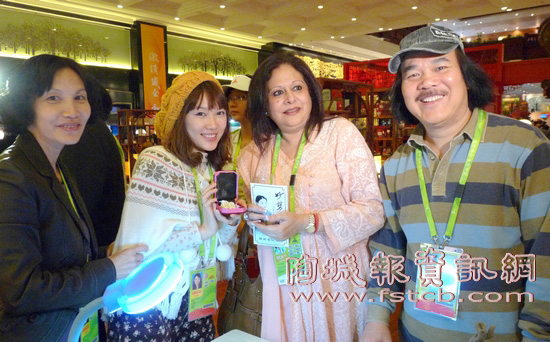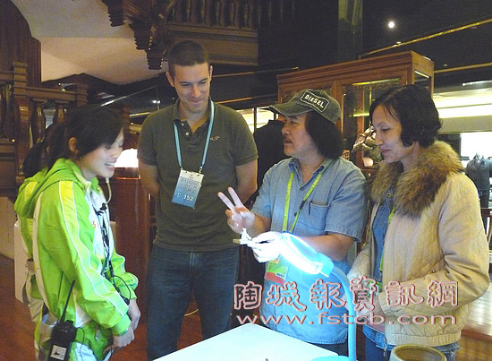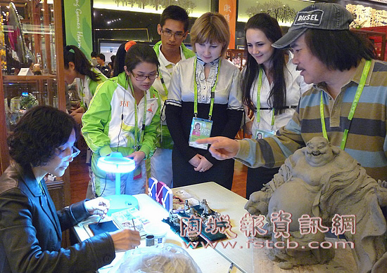 亚运期间,钟汝荣、冼艳芬、钟婉尧一家演示石湾公仔,受到外国贵宾称赞。图为外国贵宾观看石湾微塑山公技艺演示。