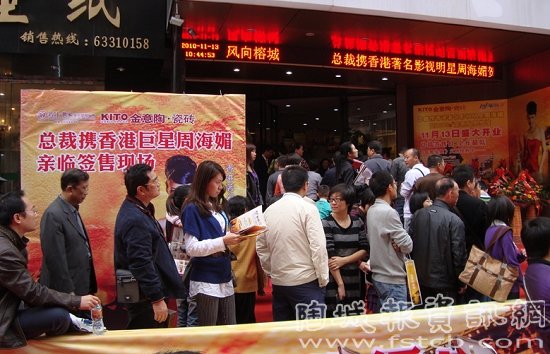 香港著名影视明星周海媚的出现可以说是万众瞩目,无论是金意陶瓷砖的消费者还是市民都纷纷前来金意陶思想馆一睹明星的风采。有的海味粉丝甚至早早地来到了活动现场,而有粉丝却为周海媚现场做了藏头诗一首……周海媚首先参观了金意陶思想馆,看到各种不同风格和应用的瓷砖,她不时用手抚摸,不时仔细观摩,对金意陶的工艺赞叹不已。随后,周海媚出席了开业剪彩仪式,并接受了金意陶公司赠送的用最新喷墨打印设备制作的瓷砖画。随着总裁签售的进行,周海媚也与“海味”们进行了互动交流,海报签名、合影留念等,在满足粉丝的同时却忙坏了安保人员。