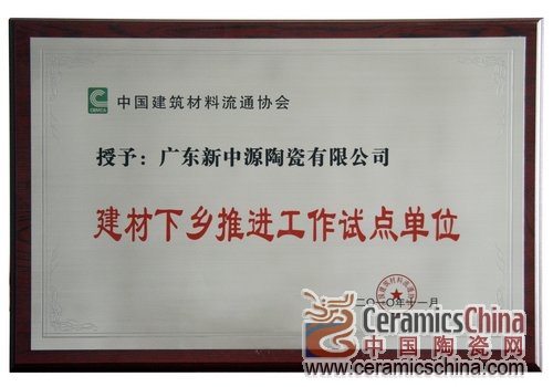 为了积极配合国家建材下乡政策的实施,中国建筑材料流通协会在全国建材领域进行建材下乡试点,通过试点企业让利形式对农户建房实施补贴,并于11月14日在北京人民大会堂召开了“2010建材下乡工作总结大会”,全面梳理和总结建材下乡前期工作,探讨进一步推动建材下乡方案的落实,会议当日发布了“首批建材下乡试点单位”名单,新中源陶瓷作为建陶行业的领军企业,获得首批建材下乡试点单位。