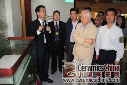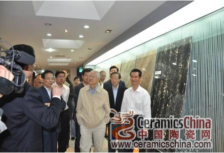 调研组一行首先来到轻质新型建材馆,张旗康董事详细为调研组介绍了目前国内唯一、代表世界最先进水平的新型建材--建筑陶瓷薄板(PP版)和无机轻质板材(QQ板)。当了解到浮在鱼缸中的无机轻质板(QQ板)50%以上的原料为陶瓷工业废渣,具备防火、隔音等多种功能以后,调研组人员都惊叹当今民营企业的创新之举。此外,工作人员还现场演示了3.5mm的PP板,其韧性和硬度令在场人员折服,而各种不同风格和堪比天然石材的表面装饰效果更令调研组人员大加赞叹。吴敬琏专家对蒙娜丽莎作为主起草人的《陶瓷板》、《建筑陶瓷薄板应用技术规程》两项国家标准颇感兴趣,对两项标准的起草程序等关键环节提出了疑问,在场的陶瓷行业专家陈帆教授一一做了解答,并就建筑陶瓷行业相关标准的制