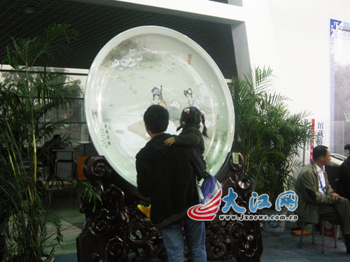 景德镇艺术陶瓷展区,一位父亲带着女儿在参观