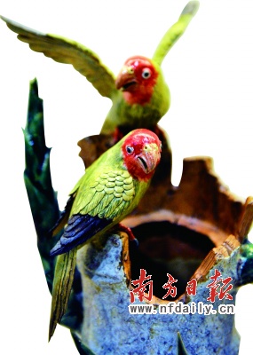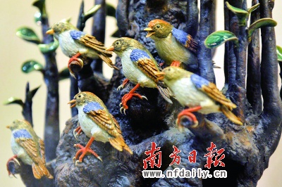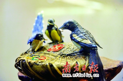 以土陶的质感衬托出花鸟的神采,罗传的陶艺花鸟作品自成一格。 张由琼摄